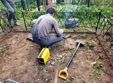 Первым делом мы принялись за уборку: убрали с территории места захоронения абсолютно всё, включая выложенную заказчиком плитку, памятники, а также сорную траву.