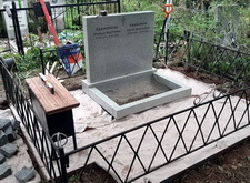 Следующим этапом в работе с могилой стала установка нового памятника, выполненного из светлого гранита и рассчитанного на двух покойных. Плиту доставили на кладбище практически сразу после изготовления, так что надпись пришлось делать уже по месту. Впрочем, на качестве работы это не коим образом не отразилось.